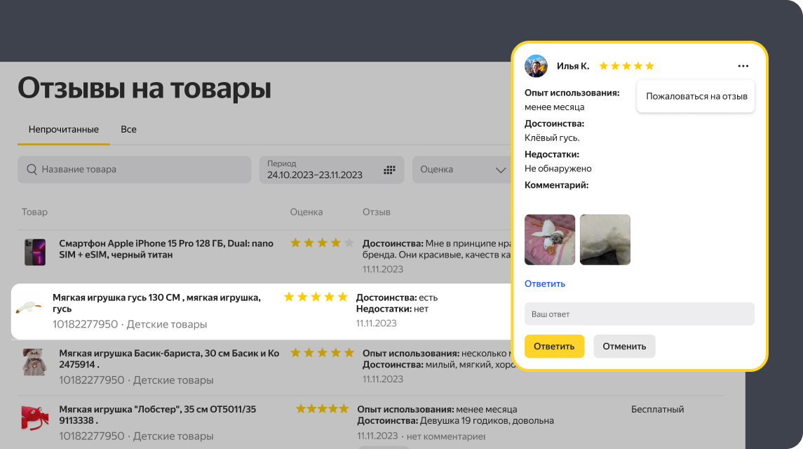 - Товар у продавца — отзывы на товар, купленный именно в вашем магазине. Отслеживайте появление новых отзывов и отвечайте на них прямо из кабинета.