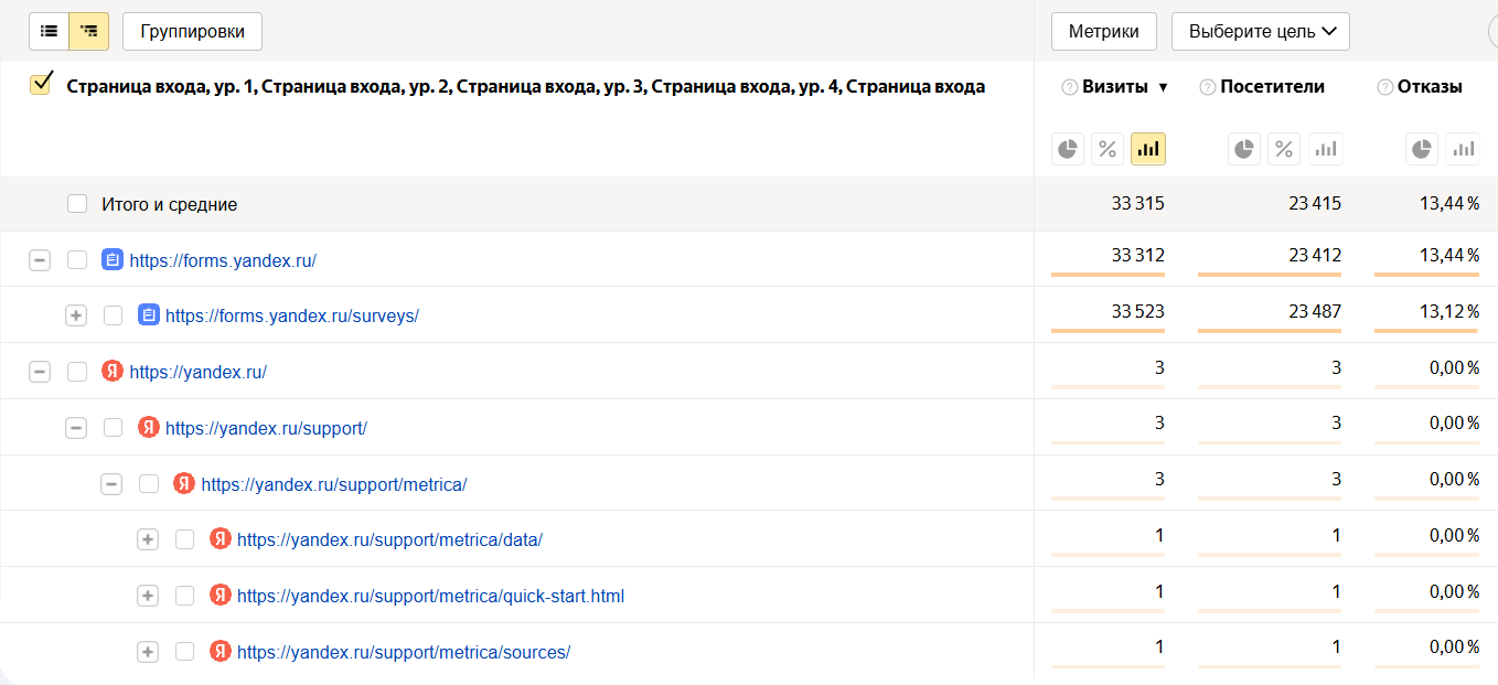 Отчет содержит статистику по страницам, с которых посетители начинают просмотр вашего сайта. Данные представлены только по тем визитам, которые начались с указанных в отчете страниц.