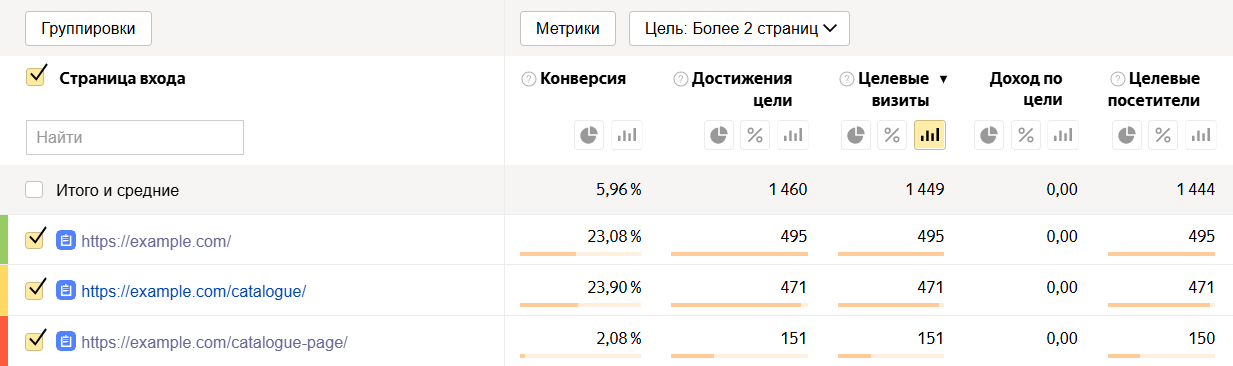 Посмотреть, какие страницы входа приносят больше целевых посетителей