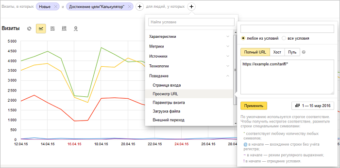 Затем уточним данные, оставив информацию о посетителях, которые просмотрели страницы тарифных планов с калькулятором в период с 1 по 15 марта. Страницы тарифов являются типовыми для сайта, на всех страницах размещен калькулятор. Поэтому в условии можно указать URL всего каталога «tariff» с помощью символа *.