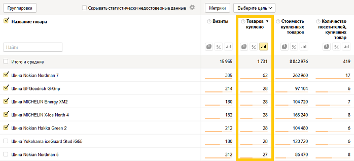 Данные в отчете сгруппированы по названию товаров, которые вы передаете в Метрику. Если вы передаете данные в разной валюте, в отчете вы можете выбрать одну из них. При выборе валюты значения денежных метрик пересчитываются в соответствии с курсом конвертации, который был днем ранее совершения дохода.