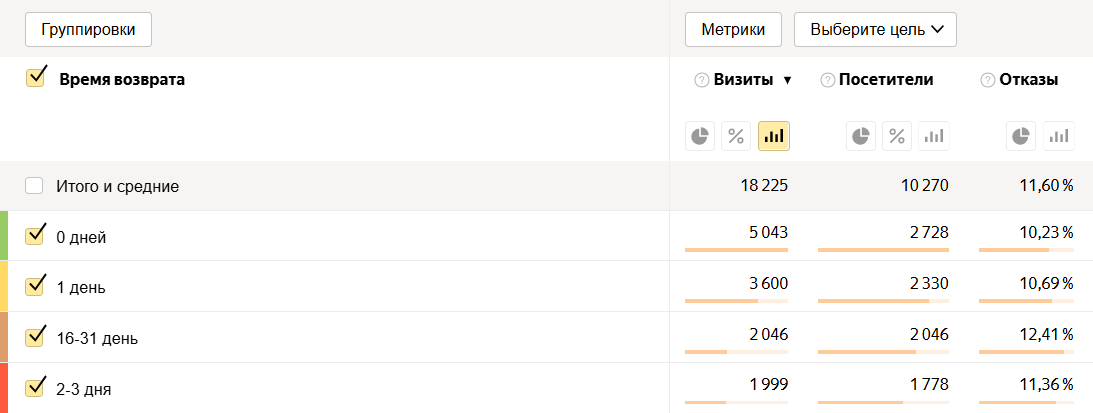 С помощью отчета вы можете определить, сколько посетителей возвращаются на сайт ежедневно. Для этого обратите внимание на строку «1 день».