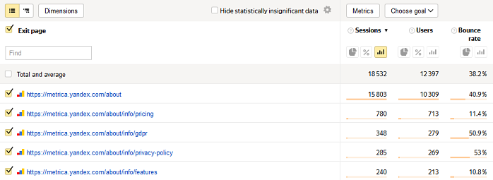退出页面统计数据可以帮助您识别那些不应该鼓励用户结束会话但仍然这样做的页面。 如果您想跟踪这些参数,您可以创建一个 Landing page 分组。