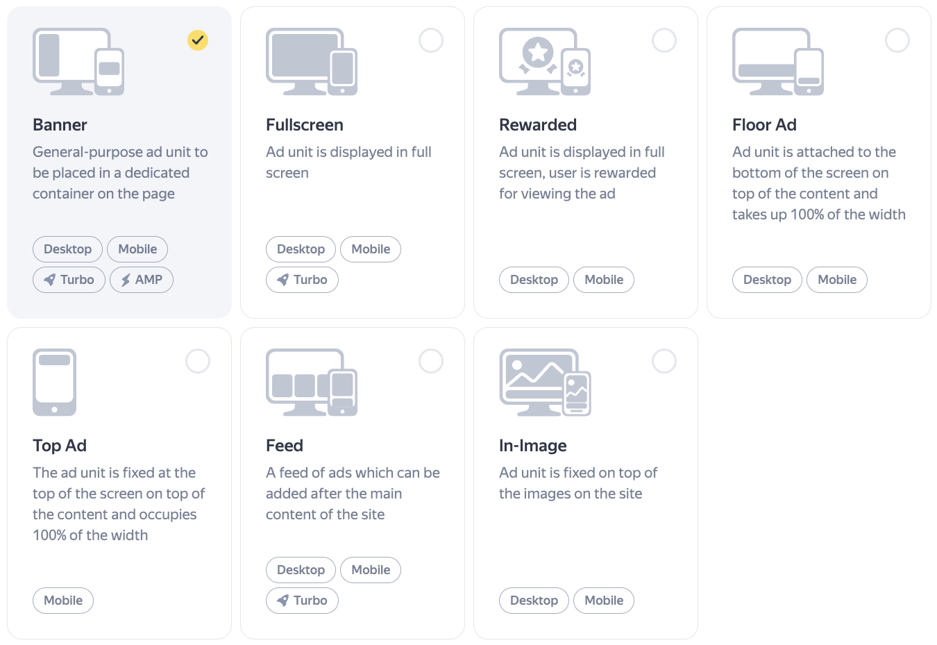 Rewarded units occupy the entire screen. The user gets a reward for viewing the ad to the end. You need to create a separate unit for each version of your site.