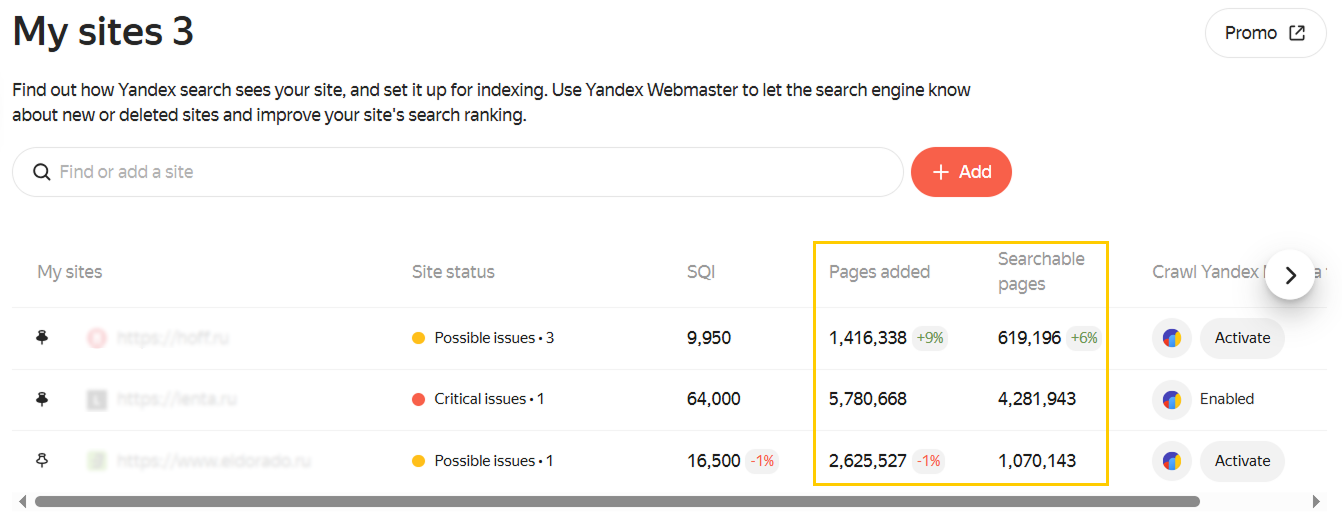 Check the number of pages loaded by the robot and the pages participating in the search. To do this, open the My sites page in Yandex Webmaster. If the number of loaded pages is much larger than the number of pages in the search, the robot probably finds a large number of similar pages on the site or duplicate pages that shouldn't be indexed.