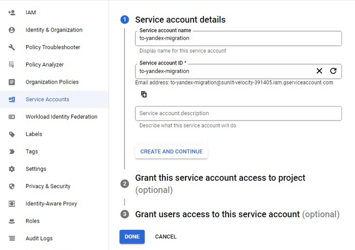 A secret file is a file with an access key. Yandex 360 for Business uses it to connect to Google Workspace. To prepare it, you need to create a service account in Google Workspace, then create a new secret and save it to a file.
