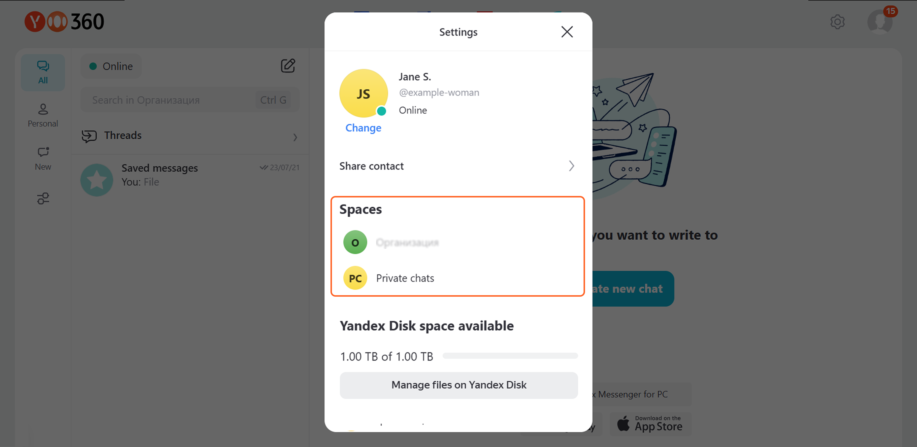 You might need to switch to another Yandex Messenger space. Spaces allow you to separate personal and work chats as well as chats in different organizations (if you belong to more than one organization) from each other.