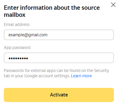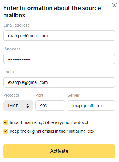 Log in to the Yandex email account where you want to import messages from Gmail. How do I log in?