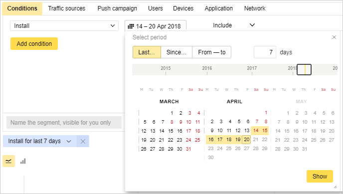 For example, you need to create a segment of users who installed your game during the past week. In AppMetrica, go to any report and choose the Conditions category. From the drop-down list, choose the event and specify the period in which it has to happen. Set the name of the segment.