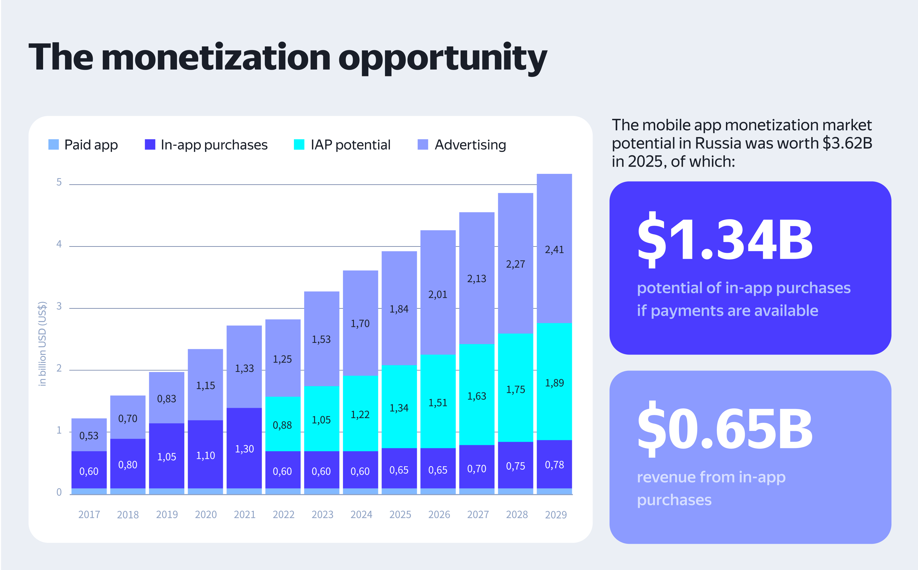 In-app spending is up, too. Global IAP revenue hit $1.54B per week in 2024, and Russia is seeing the same trend. Analysts say the IAP market in Russia could reach $1.34B in 2025 — that is, if developers can offer local payment options.