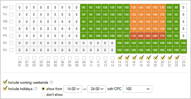To use this example, change the input data to include the OAuth token, the campaign ID, and the bid adjustments for each day of the week and each hour. If you're submitting a request on behalf of an agency, be sure to include the client's login.