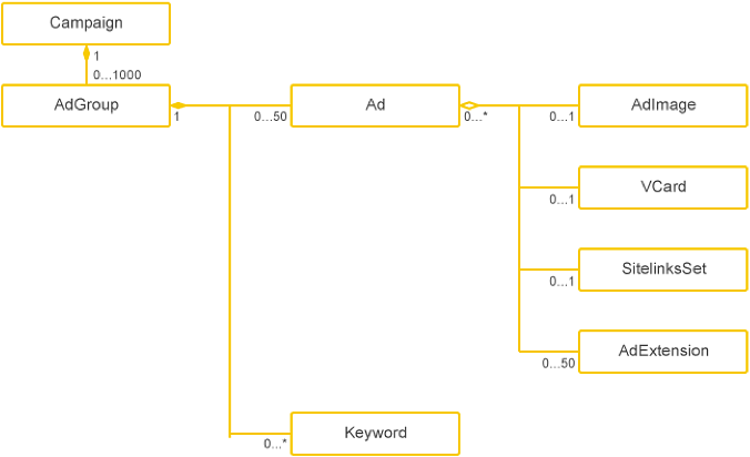 The API provides a service for each object class: Campaigns for managing campaigns, AdGroups for managing ad groups, Ads for managing ads, and others. You can find the full list of services in the documentation.