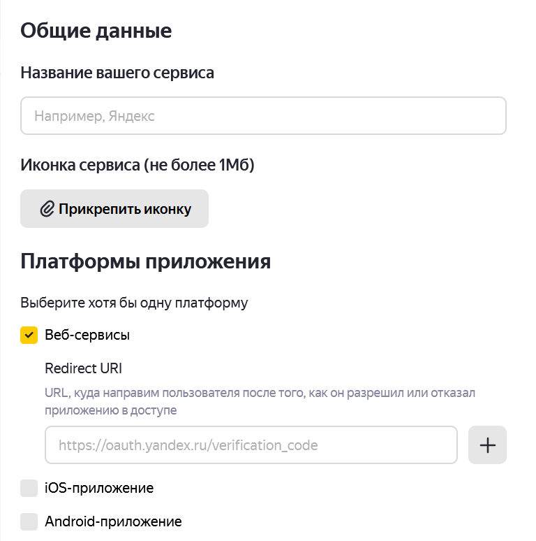 Log in to Yandex with your developer username. In Yandex OAuth, open the New client page and fill in the required fields. All fields are going to be editable.