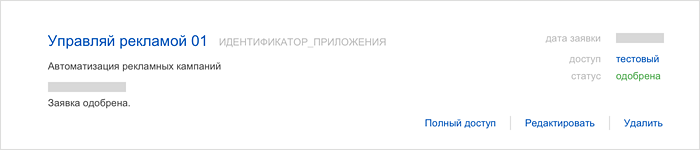 После регистрации приложения на Яндекс OAuth нужно подать заявку на доступ к API Директа. Наличие одобренной заявки обязательно для выполнения запросов к API. Получив заявку, мы добавим ваше приложение в реестр приложений, работающих с Директом, и сможем обращаться к вам как к его разработчику, например, для оповещения о важных новостях или для внесения корректировок в работу приложения.