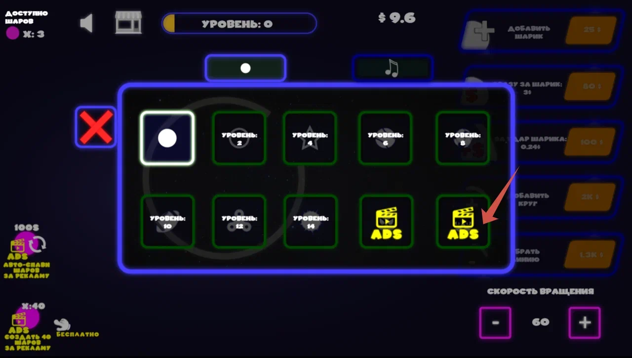 - All buttons and game elements that the player interacts with, for example: Level, Off, Buy, Enter name.