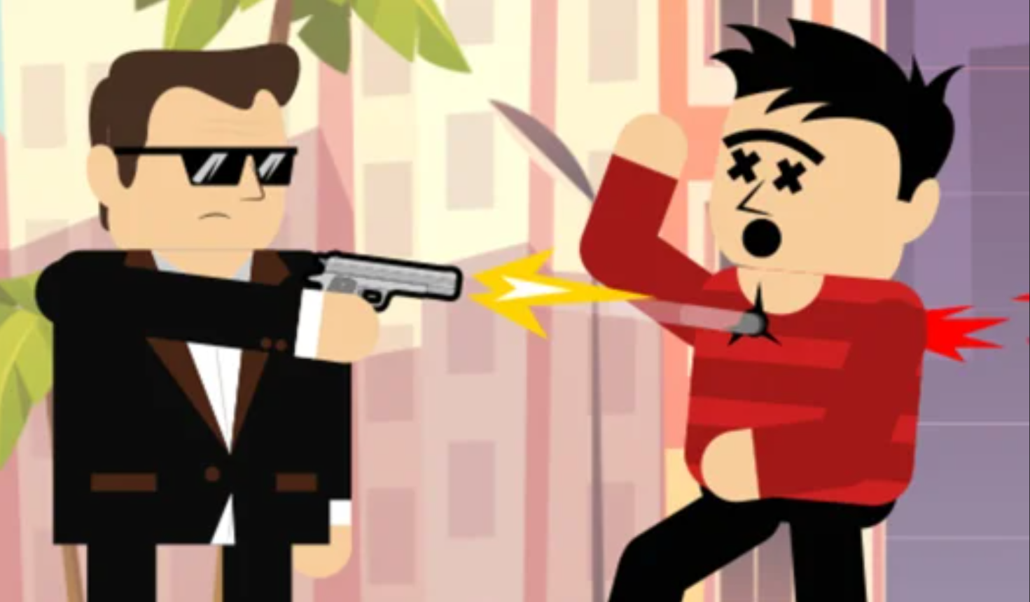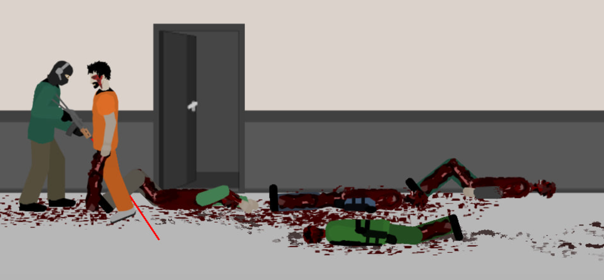 The characters are stylized, but the emphasis is on their gruesome injuries and large amounts of blood. Here, the ragdoll physics system is used to traumatize characters. |