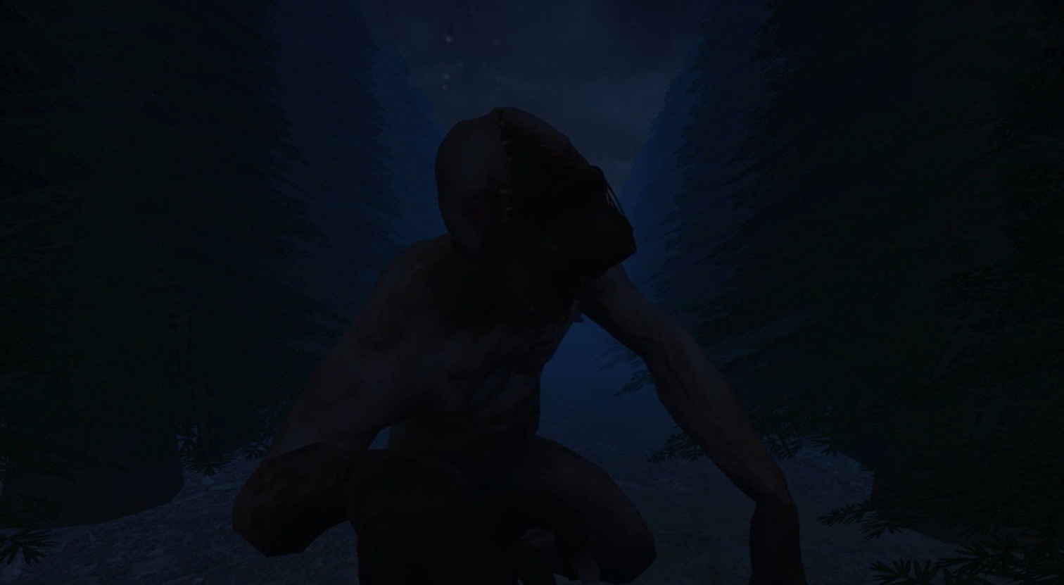 A disturbing, bloodied figure is placed in the foreground and takes up most of the screen. However, its low contrast makes it difficult to see clearly. The monster isn't the focal point. |