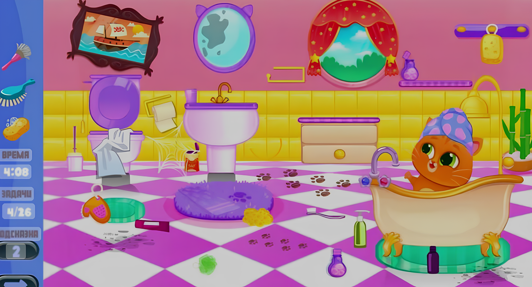 Title: "Help Kitten Bubu Clean the House" About the game: "Cleaning the house is a hard work! Kitten Bubu has made a real mess of the house, and it's your job to make every room shine again. Use different brushes to remove dust, stains, and cobwebs. Drag each item to its proper place."