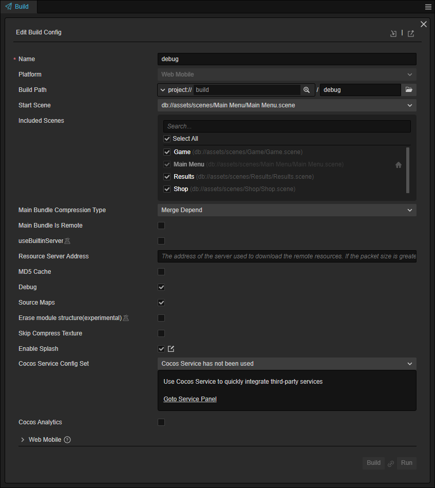Set up the parameters. It is usually recommended to enable the Source Maps and Debug options to facilitate debugging.