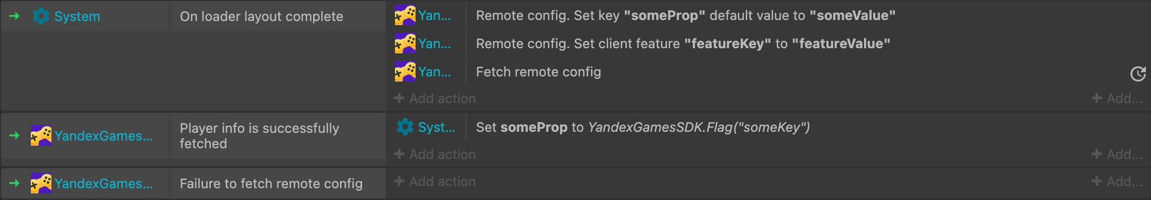 To get a remote configuration of flags (Remote Config), use the Fetch remote config action together with Player info is successfully fetched and Failure to fetch remote config. We recommend requesting flags once at the start of the game.