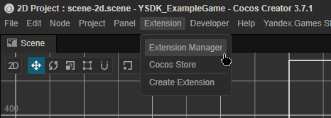 플러그인 다운로드 후, Cocos Creator에서 프로젝트를 열거나 새로운 프로젝트를 생성하세요. 상단 메뉴에서 Extension 위에 마우스를 올리고 Extension Manager를 선택하세요.