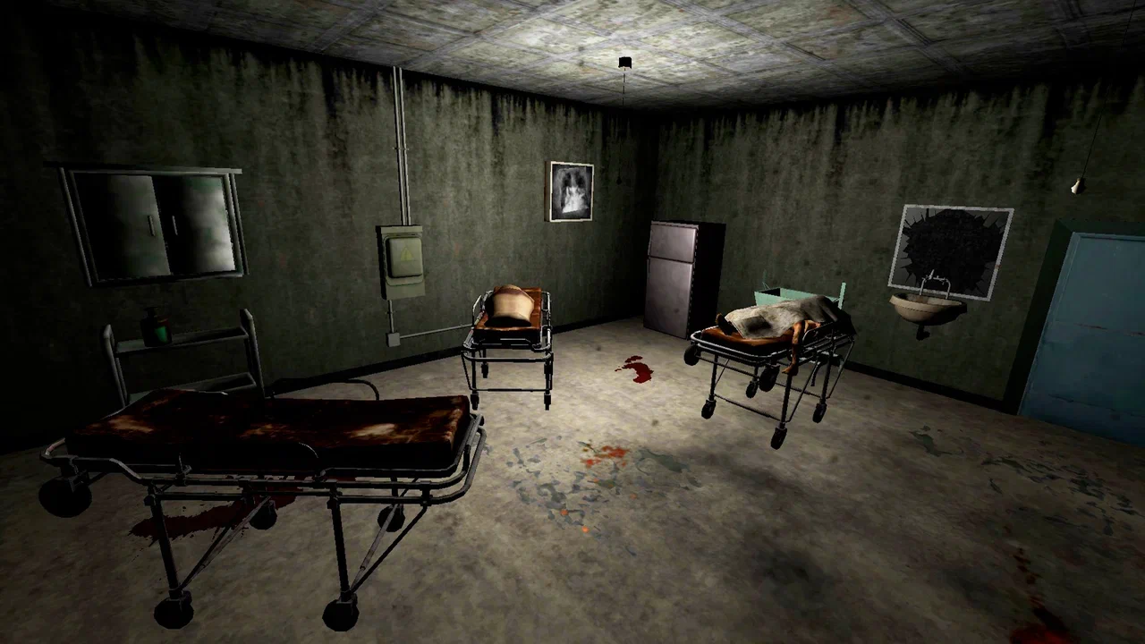 图片上的太平间逼真,有医疗设备和血迹。 |