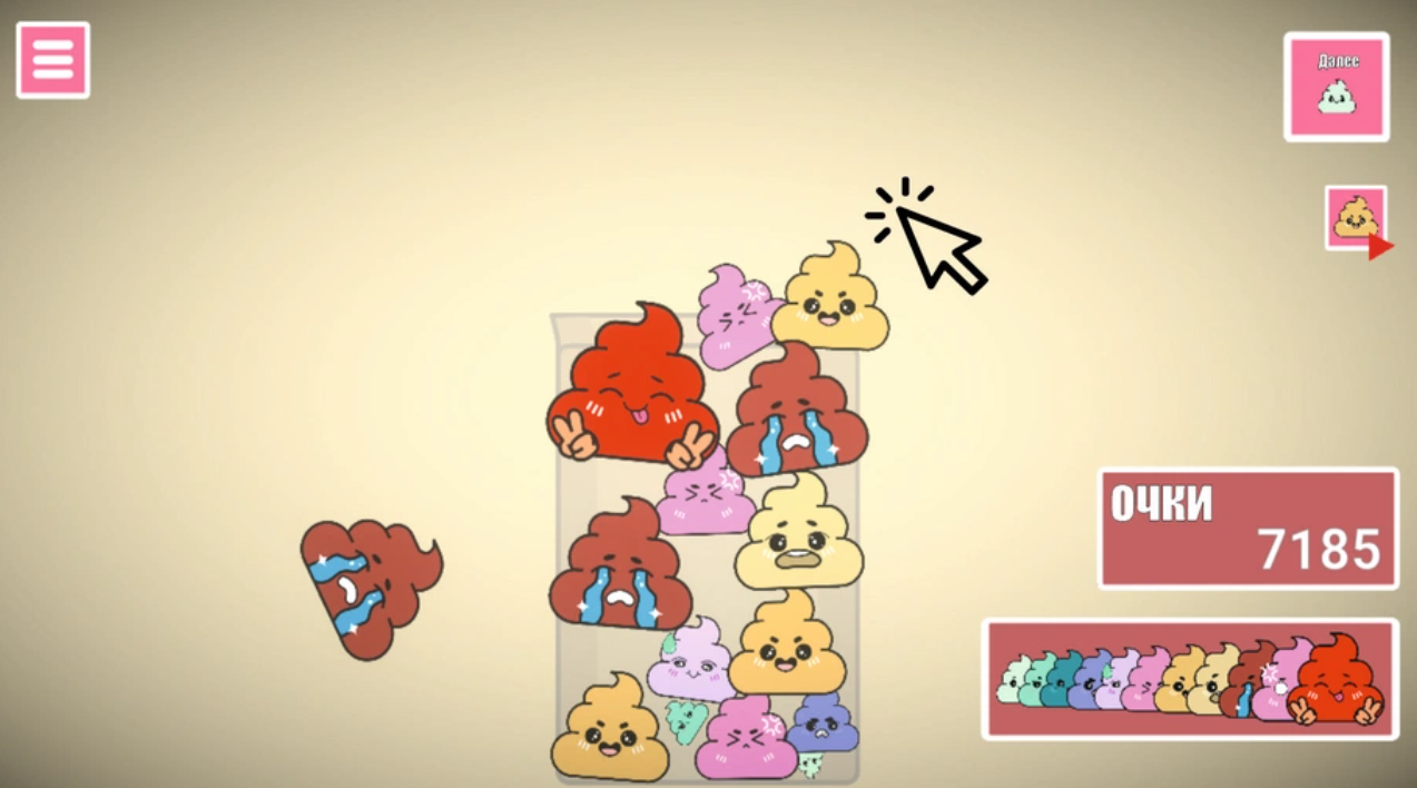 名称:「快乐粪便拼图」 关于游戏:「这是一个填满非常可爱的粪便的解谜游戏!这些可爱的不同颜色和大小的粪便将突然掉进量杯中,所以你需要精心放置它们到正确的位置。当你匹配相同的粪便时,它们会融合成更大的粪便并增加你的分数。你能抓住最大的粪便在量杯溢出之前吗?不要让粪便从碗中掉出来!」