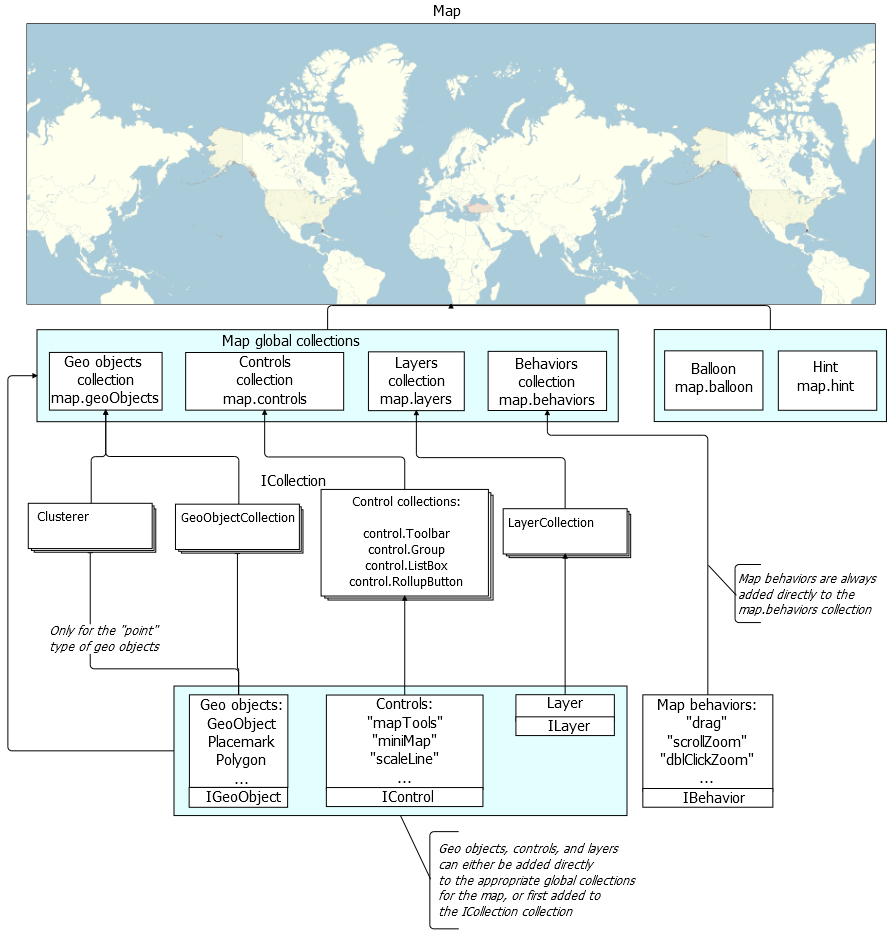 Before adding objects to global collections, they can be grouped in ICollection collections. For example, a placemark (Placemark) can be added to the GeoObjectCollection collection and then this collection can be added to the global collection of map geo objects. Then the placemark will be displayed on the map. An exception is behaviors, which are always immediately added to the global collection of map behaviors and are not grouped in lower-level collections.