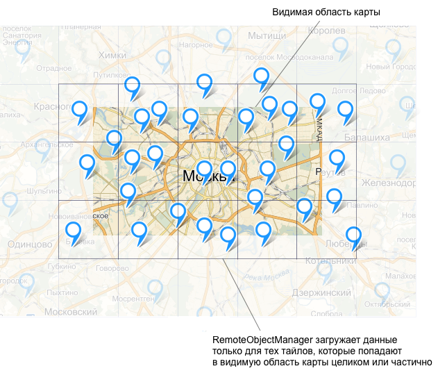 RemoteObjectManager is a layer containing a JSON description of objects being added to the map — placemarks and clusters. The description must contain the coordinates and IDs of the objects, information about their geometries, and properties, such as balloon contents. For more information about the format for describing objects, see the section Developing the backend.