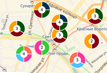 В качестве значка метки или кластера можно установить круговую диаграмму. Это может быть полезным, когда пользователям нужно показать какую-нибудь статистику, например процент школ и поликлиник в разных районах города.