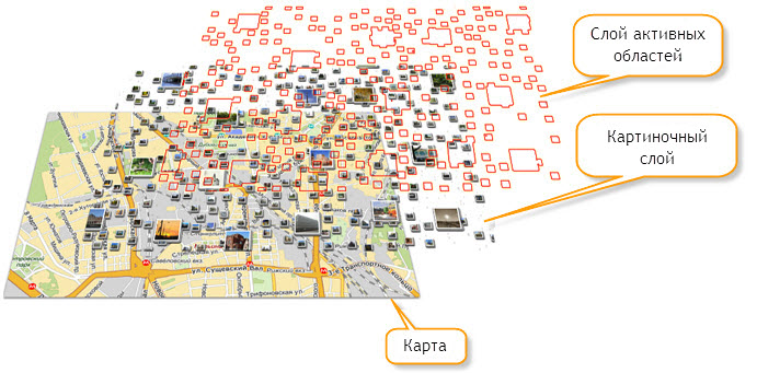 Слои активных областей используются, например, при отображении на картах Яндекса пробок и фотографий.