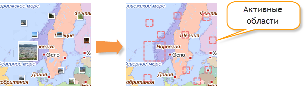 При использовании активных областей вместо показа тысячи отдельных объектов отображается один слой, содержащий изображения всех этих объектов. Поверх слоя с изображениями объектов располагается еще один слой — с информацией об этих объектах и их границах. Он позволяет сделать объекты интерактивными, то есть запрограммировать реакцию объекта на действия пользователя.
