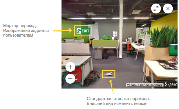 API плеера позволяет связывать между собой собственные панорамы и добавлять на них стандартные стрелки перехода. Кроме того, в качестве элементов перехода могут выступать специальные маркеры-переходы (см. иллюстрацию ниже). Эти маркеры ведут себя так же, как и обычные маркеры, но при клике на них осуществляется переход на связанную панораму. API не предоставляет стандартных изображений для маркеров-связей, их внешний вид необходимо продумать самостоятельно.