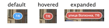 Чтобы маркер изменял свой внешний вид в разных состояниях, нужно задать отдельные изображения для этих состояний (изображения задаются в методе getIconSet). При этом необязательно задавать изображения для всех четырех состояний. Например, маркер, обозначающий дома на панорамах Яндекса, не содержит состояния 'expandedHovered'. Остальные его состояния представлены следующим образом: