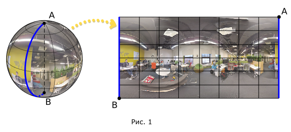 Геометрия панорамы задается координатами правого верхнего и левого нижнего углов прямоугольника, ограничивающего панорамное изображение на сфере. На рисунке ниже эти углы обозначены точками A и B: