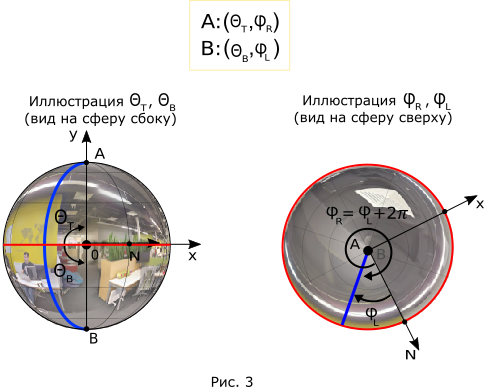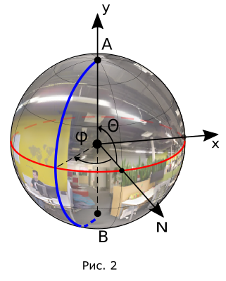 - координата — это угол между плоскостью экватора и лучом, проведенным из центра сферы в заданную точку (см. рис. 2). Для панорам с полным вертикальным обзором координата должна быть всегда равной для верхней точки (точка A) и для нижней точки (точка B). Для панорам с неполным вертикальным обзором может принимать значения в промежутке см. подробнее.