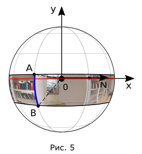 Чтобы упростить расчет геометрии, можно предположить, что линия стыка панорамного изображения на сфере совпадает с линией направления на север (см. рис. 4). Тогда , а . Обратите внимание, что если в действительности направление на север на панораме не совпадает с линией стыка изображения, то при отображении в плеере на панораме будут некорректные геодезические направления.