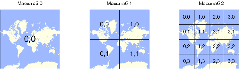 Таким образом, каждый шаг масштаба разбивает карту на 4N тайлов, где N — коэффициент масштабирования.