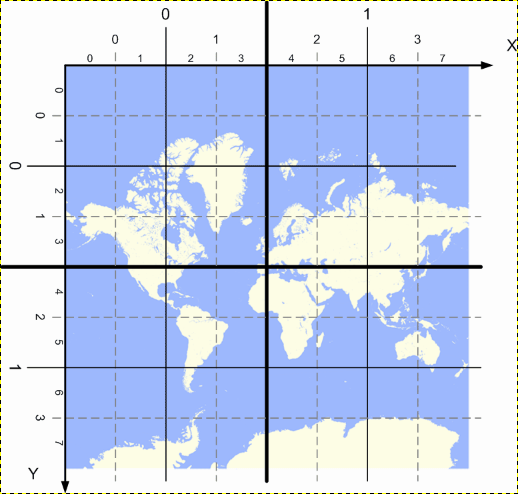 На наименьшем масштабе (коэффициент масштабирования 0) вся территория покрывается одним тайлом.
