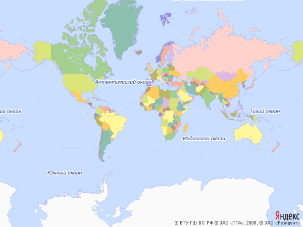 Для того, чтобы карту мира можно было отобразить на плоскость, необходимо каким-то образом построить проекцию изображения. Яндекс Карты, как и большинство других геоинформационных сервисов, используют проекцию Меркатора.