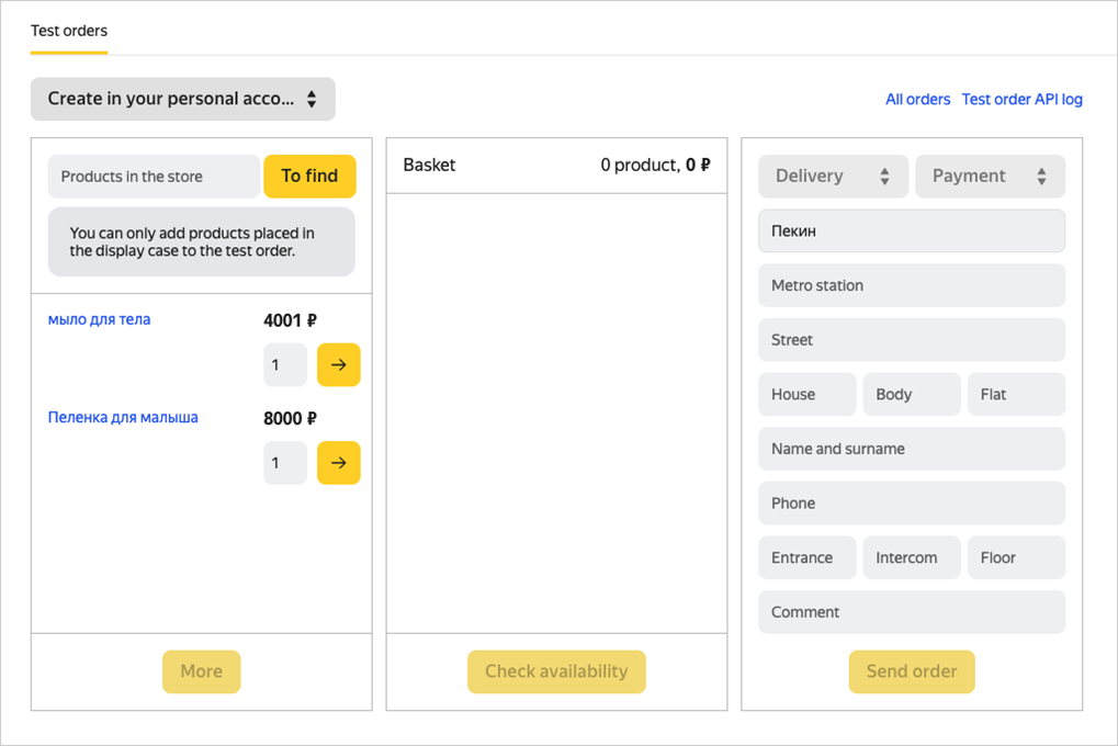 On Yandex. Market, you can test the store and its API on test orders before you start working with real ones. You can emulate the following processes: