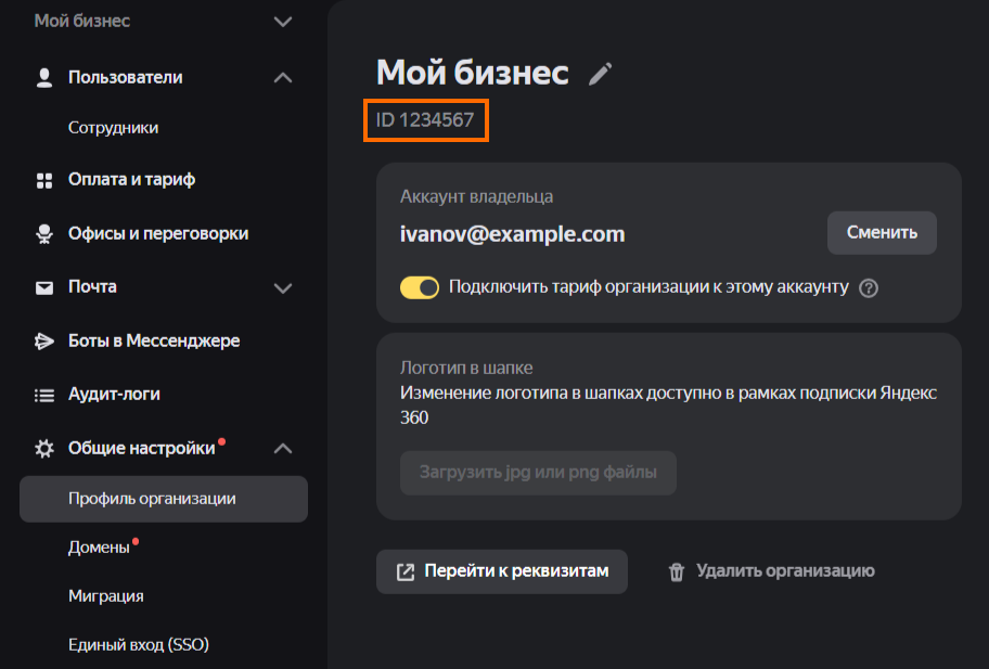 Идентификатор организации. Где взять идентификатор организацииЕго может посмотреть администратор в кабинете организации Яндекс 360 для бизнеса: