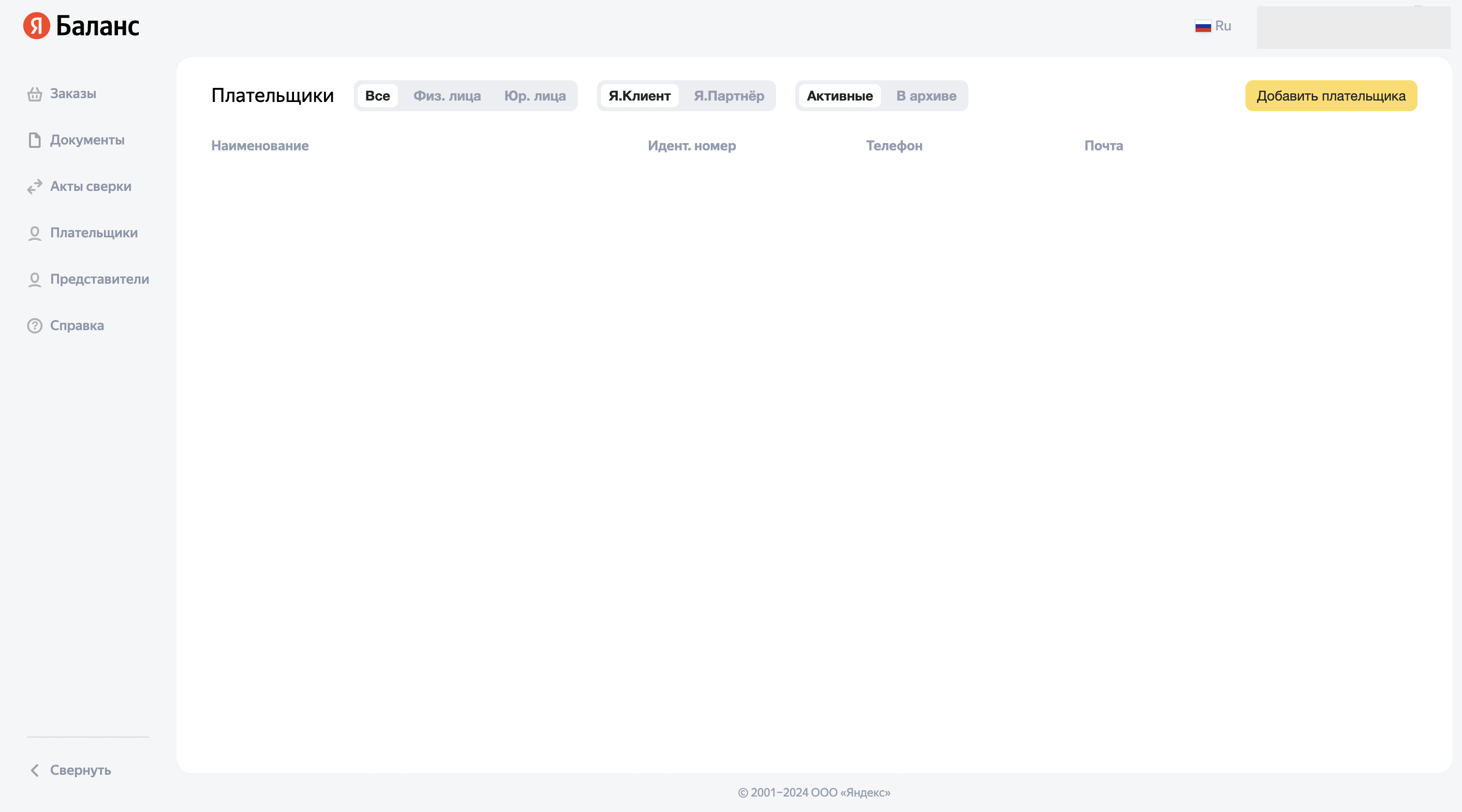 В текущей вкладке браузера открывается раздел «Плательщики» Баланса. Здесь можно отредактировать данные имеющихся плательщиков, а также добавить новых.