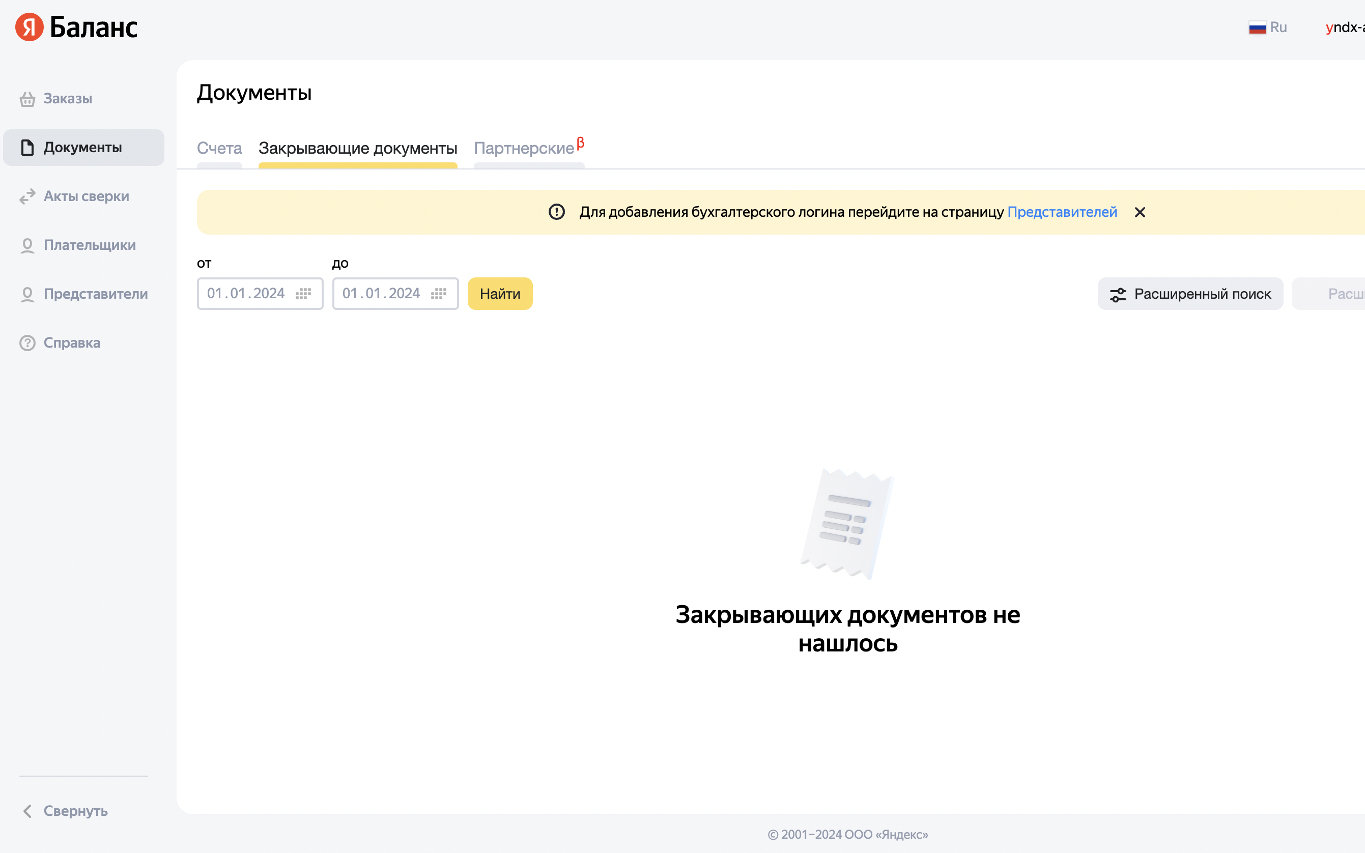 В текущей вкладке браузера открывается раздел “Документы“ Баланса. Здесь можно ознакомиться со списком и статусом счетов и закрывающих документов, а также скачать отчет или получить его на почту.