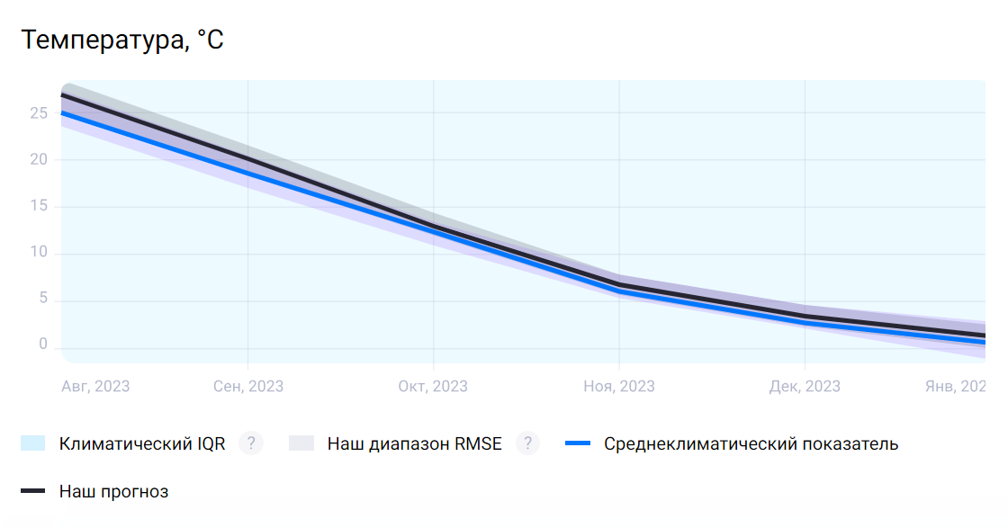 Сезонный прогноз – это помесячный прогноз аномалий погоды, разработанный с применением искусственного интеллекта и учитывающий исторические данные. Отчет охватывает следующие шесть месяцев и выделяет тенденции температуры и осадков по отношению к климатическим нормам (климатической статистике, усредненной за последние 30 лет) для указанного местоположения.