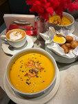 Еда безумно понравилась , наверное одно из демократичных по цене и вкусных мест Москвы , процветания и сил в условиях жесткой конкуренции всей AVA! Единственно мы с подругами оказались в такой день , когда глушили связь, наверное, и более 50 минут ожидали блюдо, потому что его забили, но чек не вышел на горячем цеху и его не готовили. Официант принес извинения, угостил нас троих десертами, но мой десерт к сожалению перепутал и принес Черемуховый торт (вроде бы) вместо бананового торта, но все равно он был мил и очень старался, так как посадка была полная и , наверное , ни у одних у нас было долгое ожидание по кухне из-за Глюка связи. Очень понравились также крем и мыло, чарующий аромат. Ваш эклер 22 см с маком обещали попробовать в спб, но в спб он оказался сладким разочарованием с вареной сгущенкой внутри……