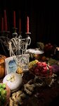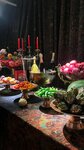 Кухня + 5 Сервис + 5 Посуда + 10! Люстры + 100! Фотозоны +5 , но… Освещение для фото МРАК Если планируете мероприятие с фотографиями, советую продумывать свет. Накрыт нарядный Рог изобилия как часть атмосферы, на который лупят прожекторы на черном фоне. Сам стол очень красивый, но на сколько бы вы не были нарядны, на фото вы проиграете этой части интерьера)