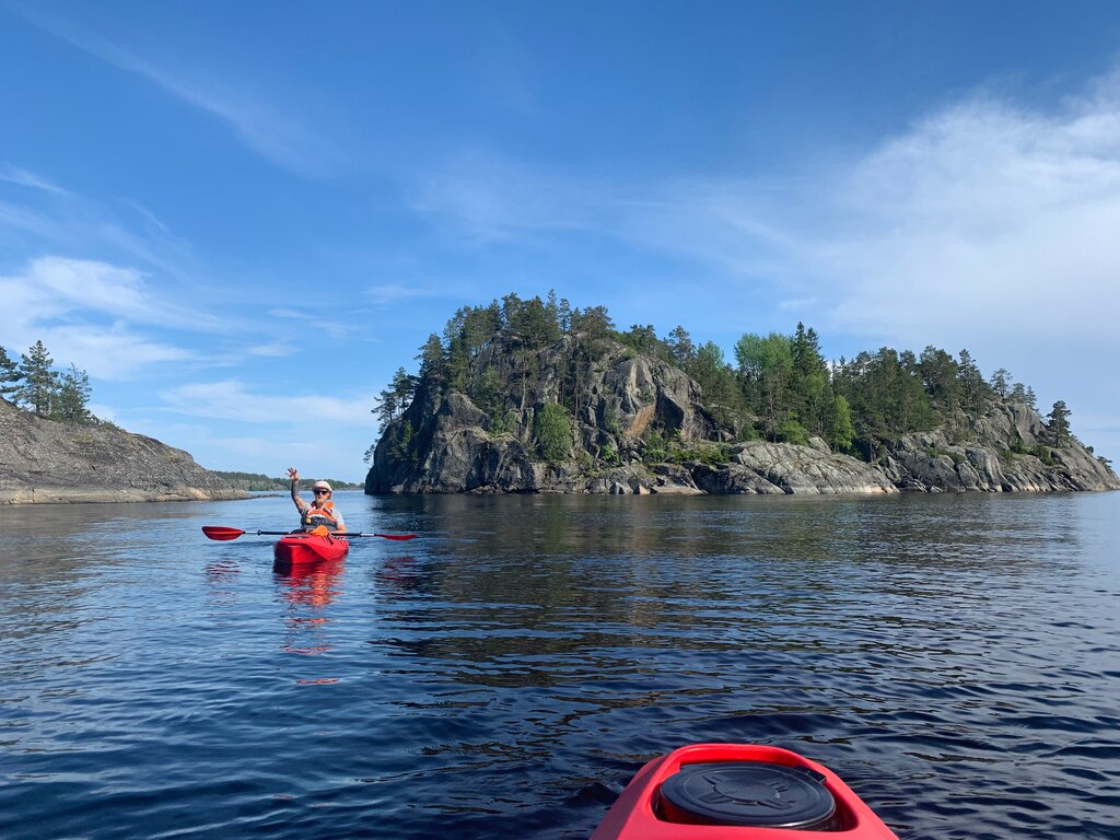 Пару дней назад ездили в тур на каяках «День наедине». У нас был прекрасный гид Иван, который нас познакомил с каяками и научил технике плавания на них. Это был первый для нас опыт, но мы остались в диком восторге; возможно, в самом начале нам было тяжело и мы не смогли с партнером быстро найти идеальный баланс, но под конец нашей прогулки мы смогли ощутить себя викингами на дракарах) Также помимо каяков Иван приготовил безумно вкусный обед- финский суп Лохикейто. После этого мы поднялись на высокую точку острова Хонкасало-гору Вахтимяки и смогли увидеть с неё и другие острова Ладожских шхер. Красота нереальная, просто сказочная. Спасибо большое за такую чудесную программу Ивану. Смогли прочувствовать карельскую красоту на все 100% и остались в восторге от этих мест) еще вернемся🤘🏻