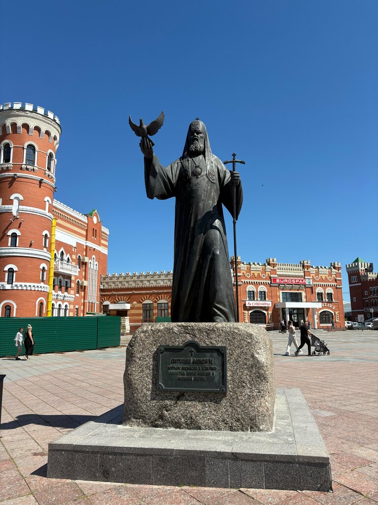 Величественный, добротный памятник святейшему патриарху Алексию ll, так много сделавшему для РПЦ, Марийской епархии находится на Патриаршей площади Йошкар-Олы. Рядом набережная Брюгге, удивительные часы с 12-ю апостолами. Замечательные виды на реку и мост. Посетите обязательно, красота впечатляет! Осмотрите всё не спеша. Мы были здесь в Рождество.