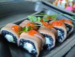 Филадельфия в кунжуте с атлантическим лососем, Тейшоку ролл с пикантым соленым огурцом, Конан ролл с сырной шапочкой, Запеченный Банкай ролл с атлантическим лососем, Жареный Мураками ролл с морским тунцом и японским омлетом тамаго *Имбирь, соевый...
